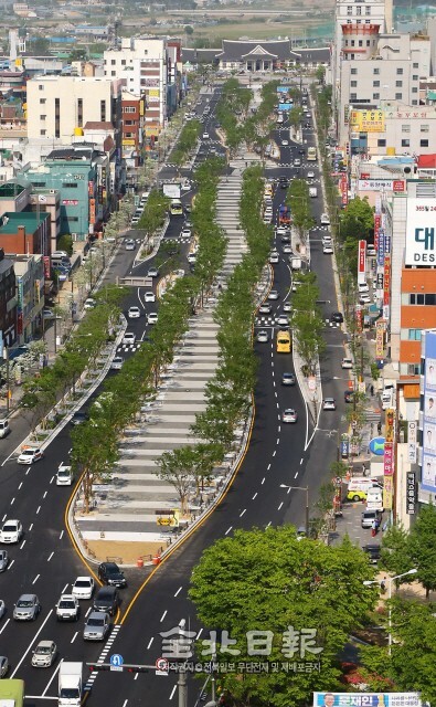 전주시는 기존 차선과 인도폭을 줄이는 대신 도로 중앙에 사람이 머물고 문화를 즐길 수 있는 6차선(15~20m) 가량의 폭을 가진 보행광장을 만들고 시민참여형 명품 가로숲길도 조성했다.