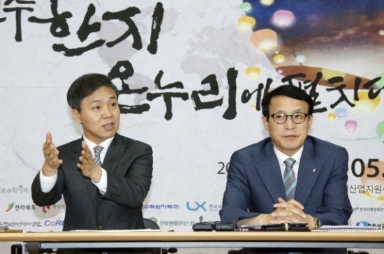 ▲ 2017 전주한지문화축제 기자회견이 열린 15일 전주시청 브리핑룸에서 김승수 전주시장과 이남호 조직위원장이 축제의 의미를 설명하고 있다. 사진제공=전주시