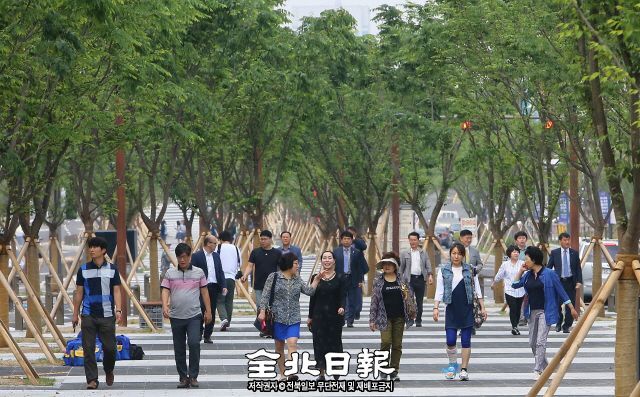 ▲ 전주역 앞‘전주 첫 마중길 시민희망나무 헌수 기념행사와 문화행사’가 열린 24일 첫 마중길에서 시민들이 나무가 우거진 마중길을 걷고 있다.