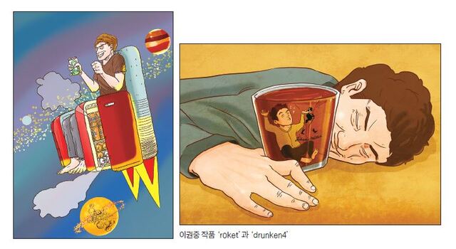 이권중 카툰일러스트 작가가 8일부터 14일까지 전주 교동아트스튜디오에서 두 번째 개인전 ‘너 취했구나?’를 연다. 작가는 첫 번째 개인전에 이어 두 번째 개인전에서도 술을 그렸다. 작가는 술을 마시면 현실에 꽁꽁 묶여 어두웠던 상상이 머릿속에 들어와 생생해지고 환해진다고 했다. 맥주가 가득한 불타는 냉장고를 타고 우주를 날아보는 상상, 장맛비 시원하게 내리는 날 마른 땅에 누워 막걸리를 마시고 늘어지게 낮잠 자는 상상 같은 것 말이다. 결국, 술을 통해 현실의 아픔을 이야기하고 현실을 뛰어넘는 그림도 그린다.