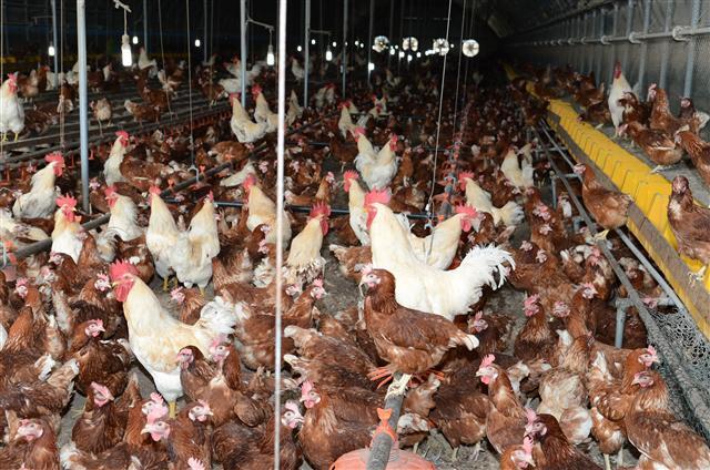 20일 남원시 운봉읍의 한 동물복지농장. 이 농장은 남원지역 1호 동물복지농장으로, 3개의 사육장에서 총 1만8000여 마리의 닭을 키우고 있다. 사육장 당 6000여 마리의 닭이 넓은 사육장을 자유롭게 뛰어다니며 한 쪽에 마련된 산란장에 스스로 들어가 알을 낳고, 횃대에 올라 쉬기도 한다.