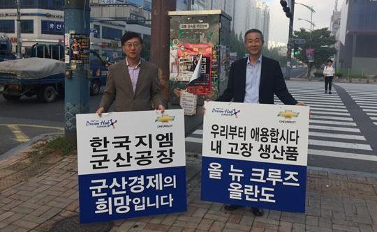▲ 김용환 한국지엠 군산공장발전 실무협의회위원장(왼쪽)과 문용묵 군산시 지역경제과장이 18일 수송동 롯데마트사거리에서 ’내고장 생산품을 애용하자’는 피켓을 들고 홍보하고 있다.