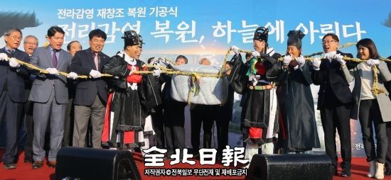 ‘전라감영 복원, 하늘에 아뢰다’를 주제로 열린 이날 기공식에는 송하진 전북도지사와 김승수 전주시장, 김명지 전주시의회의장, 이명우 전라감영 복원 재창조위원회 위원장, 윤석정 전북일보사 사장 등 기관단체장과 도·시의원, 전라감사 후손 등이 참석했다.