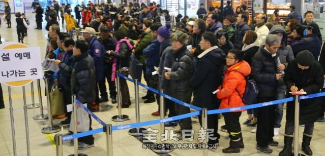 오전 9시부터 시작한 발매에 100명 남짓한 시민들이 전주역 대합실을 찾았다. 예년과 비교하면 부쩍 수가 줄었다. 인터넷 판매가 전체 배정 물량의 70%를 차지하고 있는 데다 온라인 구매 문화가 보편화돼 긴 줄을 보기 힘들다는 게 코레일 관계자의 설명이다.