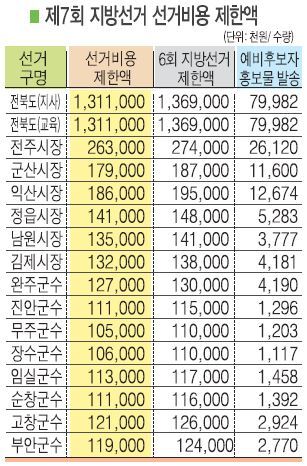 전라북도선거관리위원회는 6·13 지방선거의 선거비용제한액과 예비후보자 홍보물 발송 수량을 확정, 도 및 구·시·군 선거관리위원회별로 지난 2일 공고했다.