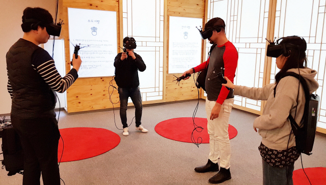 ▲ 6일 한국전통문화전당에서 VR체험공간 개장을 앞두고 관계자들이 시범을 보이고 있다. 사진제공 = 전주시