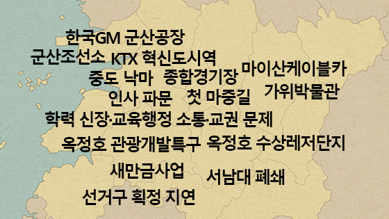 정읍에서는 옥정호 수상레저단지 용역 반발, 남원에서는 서남대 폐쇄 이후 공공의료대학 유치 문제가, 완주는 읍면간 개발 불균형 해소 문제가 표심을 자극하는 쟁점이 되고 있다.