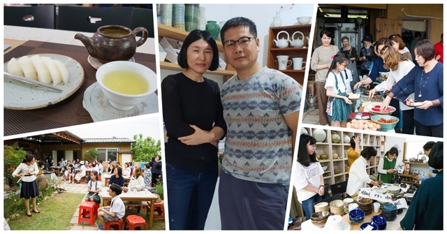 ▲ 전주 장자마을에 터를 잡은 ‘장자요’공방에서 만난 유신아, 방호식 도예가 부부. 지난달 27일 전주 ‘장자요’공방에서 열린 ‘오픈 하우스’에서 방문객들이 생활도자기에 담긴 음식을 즐기고, 그릇을 구경하고 있다.