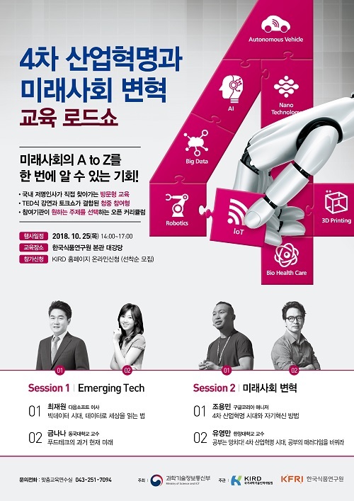 한국식품연구원과 국가과학기술인력개발원이 함께 주관하는 로드쇼는 4차 산업혁명을 주도하는 핵심 기술 동향을 살펴보고, 미래사회 대응 전략을 모색하기 위해 마련됐다.