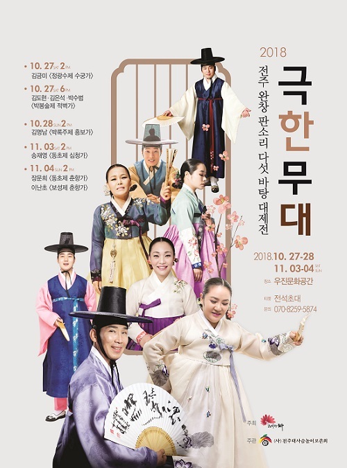 전주시는 오는 27~28일, 다음 달 3~4일 전주 우진문화공간에서 수궁가와 적벽가, 흥보가, 심청가, 춘향가 등 판소리의 진면목을 알리는 ‘2018 전주 완창 판소리 다섯바탕 대제전 극한무대’를 연다고 25일 밝혔다.
