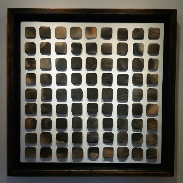 이 작가는 노천소성기법으로 일정한 크기의 도자 조각들에 자연의 색감을 불어 넣었다. 노천소성기법은 평지나 우묵하게 파인 곳에 토기를 놓고 나무를 쌓아 태워서 불의 효과를 이용해 토기를 굽는 방식.