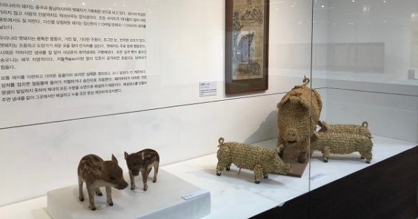 이 중에는 재물과 복을 불러온다는 산돼지를 그린 민화 ‘산돈도’, 청동기로 만든 솥형태의 조선후기 제기 ‘시정’(豕鼎), 왕실 행사 때 왕권의 상징으로 사용된 ‘육정기’(六丁旗) 중 돼지가 그려진 ‘정해기’, 볏짚으로 새끼를 꼬아 만든 돼지공예품, 멧돼지 박제물 등이 눈길을 모은다.