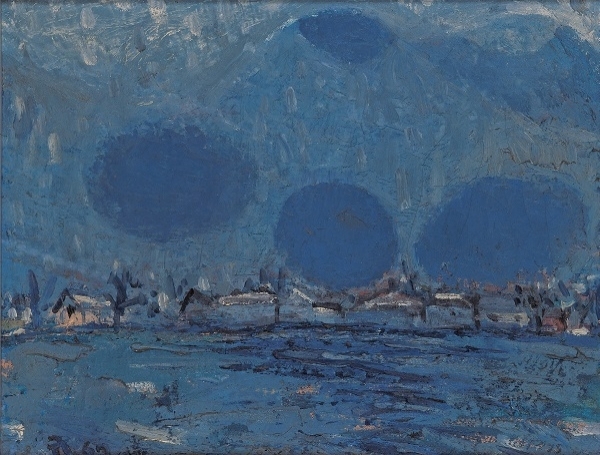 산 아래 강변 마을 풍정을 짙푸른 색조로 표현했다. 집, 나무, 산, 강 등을 멀리서 바라본 이 장면은 모든 대상의 형태감이 지극히 생략적이다. 이러한 기하학적인 구도와 명확한 색채의 대비는 모던아트협회의 전형적인 양식 중 하나이기도 했다. 거친 질감, 절제된 색채를 통해 다소 우울한 시적인 감성을 자극한다.