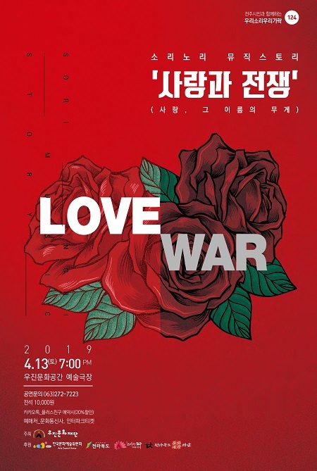 우진문화재단의 기획공연 ‘우리소리 우리가락’의 124번째 공연으로 소리노리 뮤직스토리의 ‘사랑과 전쟁’이 13일 오후 7시 우진문화공간 예술극장 무대에 오른다.