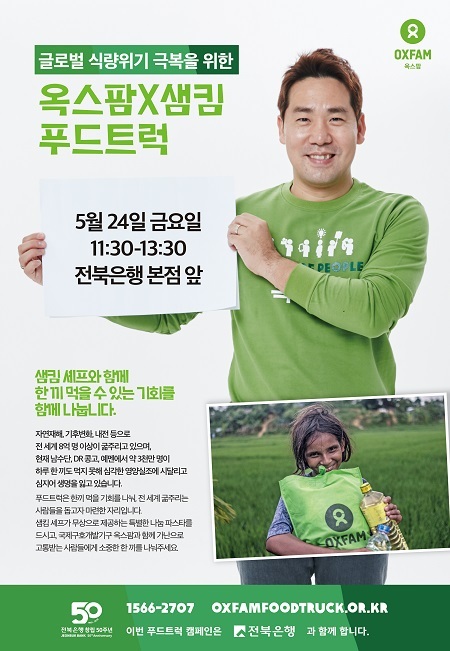 JB금융지주 전북은행(은행장 임용택)은 오는 24일 전북은행 본점 앞에서 옥스팜코리아(대표 지경영)와 함께 전북은행과 함께하는 ‘옥스팜X샘킴의 푸드트럭’ 행사를 개최한다고 22일 밝혔다.