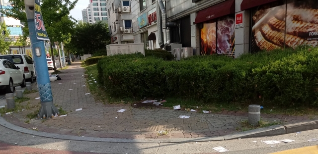 각종 홍보 전단지 및 담배꽁초 등 함부로 버려져…성숙한 시민의식 절실