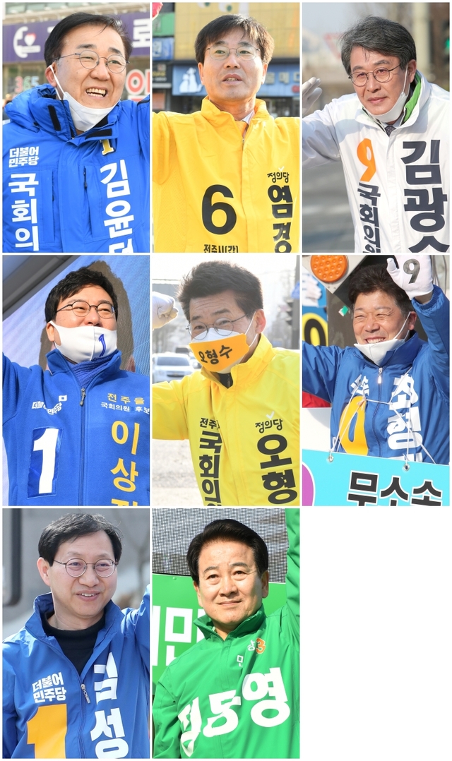 3명의 국회의원이 배출되는 전주지역 곳곳에서는 이른 아침부터 후보자와 선거운동원이 거리 유세를 벌이며 유권자 표심 공략에 나섰다. 출근길 교통량이 많은 주요 지점마다 후보들이 자리 잡았다.중앙당 차원에서 조용한 선거 유세 지침을 내린 더불어민주당 소속 후보들의 경우 대부분 선거송을 틀지 않고 유세에 나섰다.