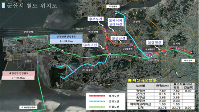 군산지역 폐철도 예정 구간은 △부두선(해망동 수산시장~구 군산화물역) △군산선(구 군산화물역~구 대야역) △페이퍼코리아선(구 군산화물역~경암동 철길마을) △옥구선(군산선 분기점~산단인입철도 교차점) △장항선(구 대야역~군산선 경계) 등으로 약 24㎞에 달한다.