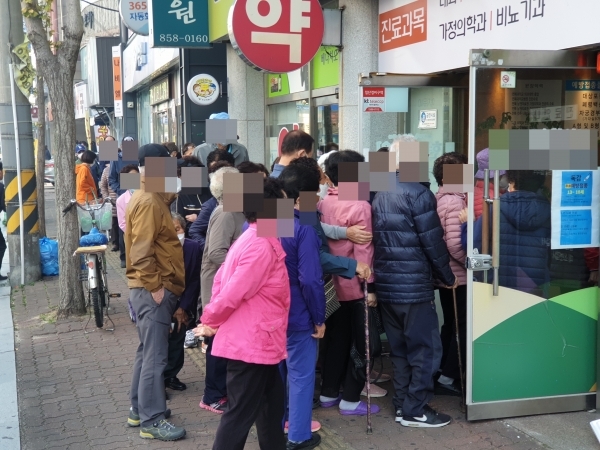 아침 일찍부터 한 시간여 동안 병원 앞에서 기다린 이들은 8시 20분께 병원 문이 열리자 일제히 번호표를 뽑느라 정신이 없었다. 마스크는 쓰고 있었지만 거리두기는 무색할 정도로 전혀 지켜지지 않았다.