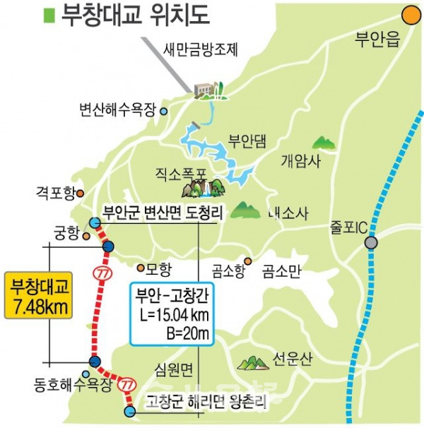 국도 77호선 부창대교 건설계획은 부안군 변산면 도청리에서 고창군 해리면 왕촌리를 잇는 15.04km(부창대교 7.46km포함)길이의 2차로를 신설·확장하는 것으로 지난 16년 간 사업이 단 한 차례도 진척되지 못했다.