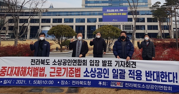 전북소상공인연합회(회장 전안균)는 5일 전북도청 앞에서 기자회견을 열고 현재 국회에서 논의중인 중대재해처벌법안 내 소상공인 적용을 반대하는 입장을 밝혔다.