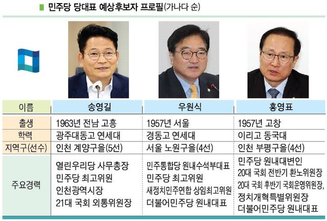 민주당 당 대표 경쟁은 송영길·우원식·홍영표(가나다 순) 의원의 3파전으로 이뤄지며, 선거는 오는 5월 9일 치러진다.