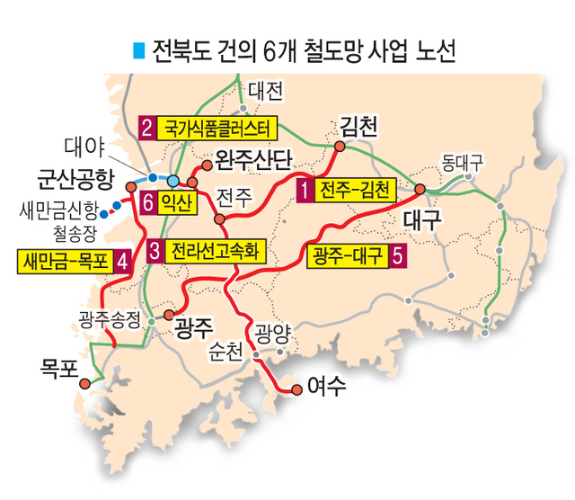 그간 전북도는 제4차 국가철도망계획에 △전주~김천 동서횡단 철도 △전라선 고속화 △국가식품클러스터 산업선 △ 대구~광주 달빛내륙철도 △새만금~목포 철도건설 △익산역 유라시아 철도 거점역 선정 등 6개 사업(연장 639km, 사업비 14조6693억 원)을 건의했다.