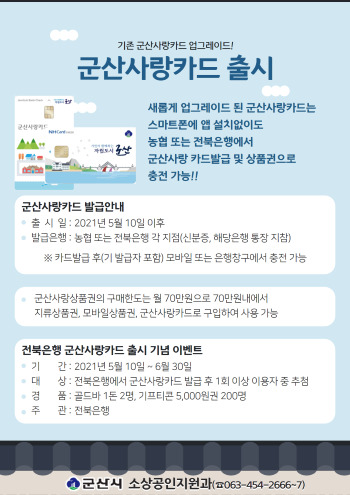 현재 군산사랑카드 발급·충전은 농협과 전북은행에서만 가능하지만 오는 7월 이후에는 새마을금고와 신협까지 확대할 예정이다.