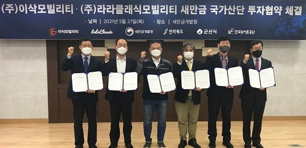 이날 협약식에는 배철환 ㈜이삭모빌리티 대표, ㈜라라클래식모빌리티 김주용 대표, 이성해 새만금개발청 차장, 윤동욱 전라북도 새만금해양수산국장, 안창호 군산시 경제항만혁신국장, 김우상 한국농어촌공사 새만금산업단지사업단장 등이 참석했다.
