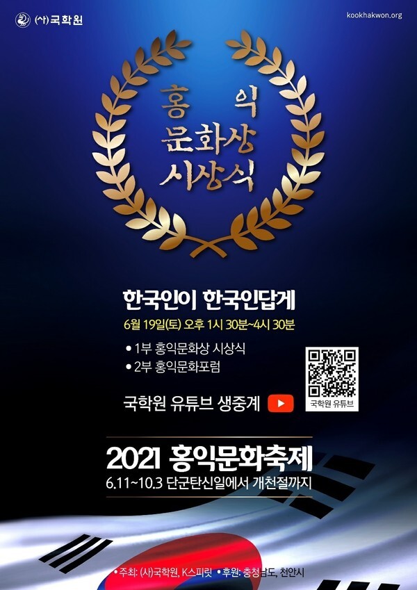 사단법인 국학원(원장 권나은)은 19일(토) 오후 1시30분부터 '한국인이 한국인답게'를 슬로건으로 한 '2021 홍익문화축제'를 온라인으로 개최한다.