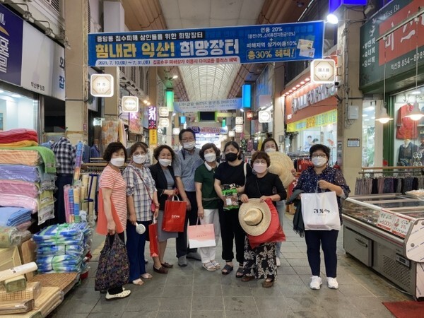 침수피해지역 소상공인들을 돕기 위해서는 무엇보다 적극적인 중앙·매일시장 이용이 필요하다는데 뜻을 모으고 자발적으로 찾아 나선 장보기 행보다.