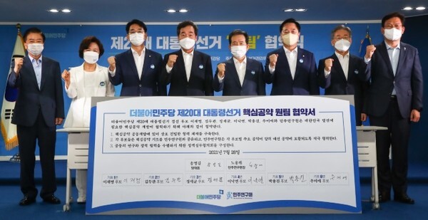 민주당은 이날 서율 여의도 중앙당사에서 ‘제20대 대통령선거 원팀협약식’을 가졌다. 이날 행사에는 이재명·김두관·정세균·이낙연·박용진·추미애(기호 순) 후보가 모두 참석했다.