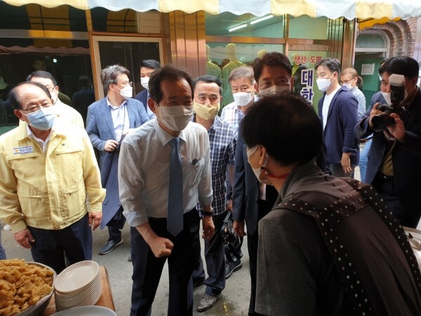 더불어민주당 대선 경선 후보인 정세균 전 국무총리가 익산 수해현장을 방문해 상인들을 위로하고 정부·국회 차원의 지원책 마련을 약속했다.