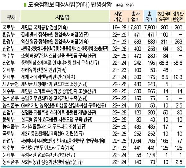 전북도가 중점적으로 예산확보가 필요하다고 본 사업은 새만금 국제공항 건설과 세계 서예비엔날레관 건립, 새만금 스마트 수산가공 종합단지 조성, 산업용 자율주행 스케이트 플랫폼 개발 등 20개 사업이다.