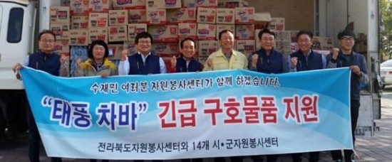 전북자원봉사센터와 14개 시군 자원봉사센터는 긴급 구호 물품 지원단을 구성해 울산시 북구청을 찾았다. 태풍 피해를 입은 수재민에게 라면 274박스, 생수 1000병, 쌀 20포 등 총 600만원 상당의 물품을 전달했다. 울산, 부산, 경주 등 경상도 지역은 태풍 차바로 주택, 농경지 침수 피해가 발생했다.