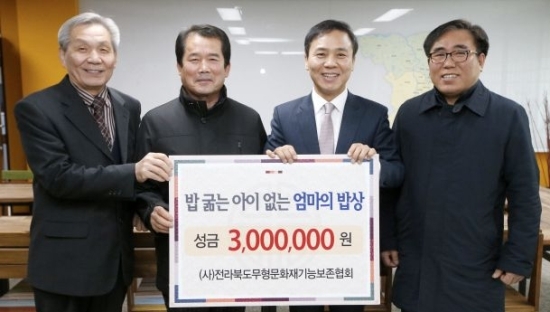 전라북도 무형문화재 기능장들로 구성된 (사)전북무형문화재기능보존협회 고수환(악기장) 이사장과 이신입(낙죽장) 명인, 오태수 한국전통문화전당 원장은 24일 전주시청을 방문해 ‘엄마의 밥상’성금 300만원을 전달했다.