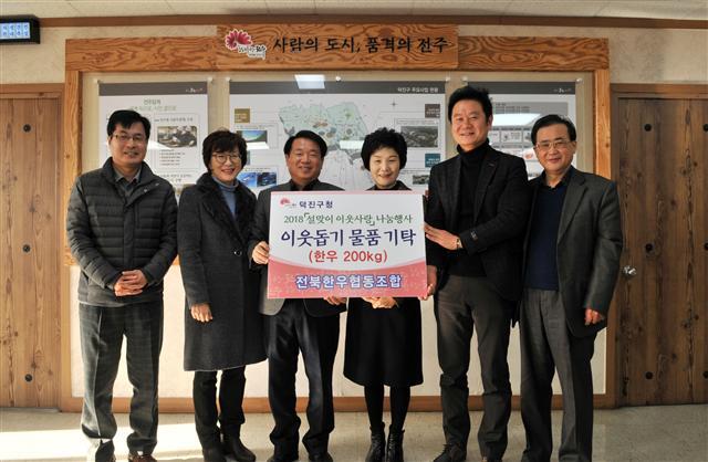 전북한우협동조합은 총체보리한우 생산자 조합으로, 1000여명의 회원을 두고 있다. 조합은 지난 2012년부터 매년 1000여만원 상당의 나눔활동을 펼쳐왔다. 지난해 11월 전주시 송천동에 총체보리한우판매점 2호점을 개점한 기념으로 덕진구에 한우를 기증했다.