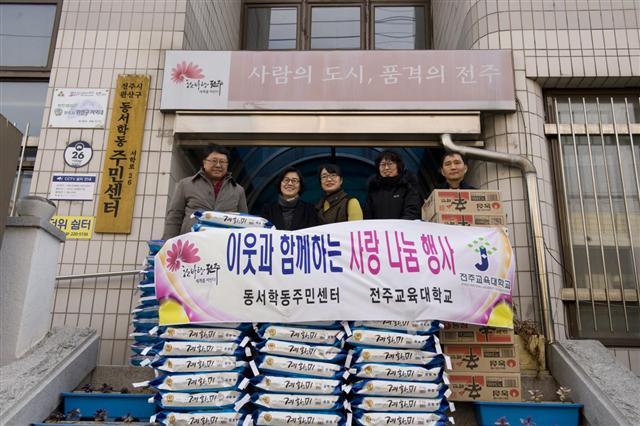 전주교대는 5일 설 명절을 앞두고 대학 주변의 어려운 이웃을 위해 전주시 완산구 동서학동 주민센터에 쌀 10kg들이 100포대와 라면 20박스를 전달했다.