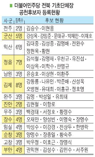 김제시장에 8명이 공천을 신청해 가장 많았으며, 정읍 7명, 익산 6명, 군산 5명, 임실·장수·부안 각각 4명, 남원·완주·순창·고창 각 3명, 전주·진안·무주 각 2명 등이다.