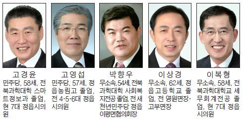 특히 5명의 후보들중 고부면 출신이 3명이고 영원면과 이평면 출신이 각 1명씩으로 덕천면 지역출신 후보가 없어 덕천면 유권자들의 표심이 향하는 후보가 상대적으로 유리할 것으로 분석된다.