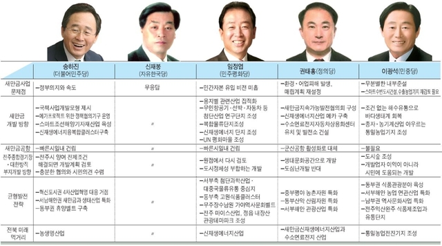 [선거 이슈 점검 : 전북도지사-지역개발 현안] 송하진·임정엽·권태홍 후보 "신재생·첨단산업 육성" 이광석 후보 "생태복원·개발 제한" 새만금 방향 시각차