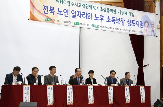 전주시와 전주시노인취업지원센터·대한노인회 전주시지회는 12일 시청 강당에서 노인일자리 관계자 등 300여명이 참석한 가운데 ‘2018 전북지역 노인 일자리와 노후 소득보장’ 심포지엄을 개최했다.