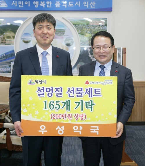 익산시 중앙동에서 우성약국을 운영하고 있는 강태욱 대표는 23일 정헌율 익산시장을 방문해 어려운 이웃을 위한 설맞이 선물꾸러미 165상자(시가 200만원 상당)를 기탁했다,