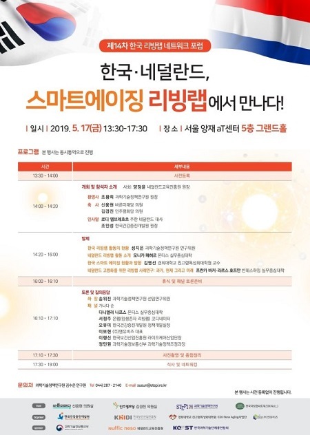 성지은 과학기술정책연구원 연구위원이 발제자로 나서 한국 리빙랩 활동의 현황에 대해 설명하고, 네덜란드 폰티스 실무중심대학의 모니카 페허르 교수가 네덜란드 리빙랩 현황에 대해 말한다. 김영선 경희대 친고령특성화대학원 교수가 ‘한국 스마트 에이징 현황과 방향’, 네덜란드 빈데스하임 실무중심대학의 프란카 바커·라르스 호프만 교수가 ‘네덜란드 고령화를 위한 리빙랩 사례 연구:과거, 현재 그리고 미래’에 대해 발제한다. 각 분야 전문가들의 토론도 이어진다.