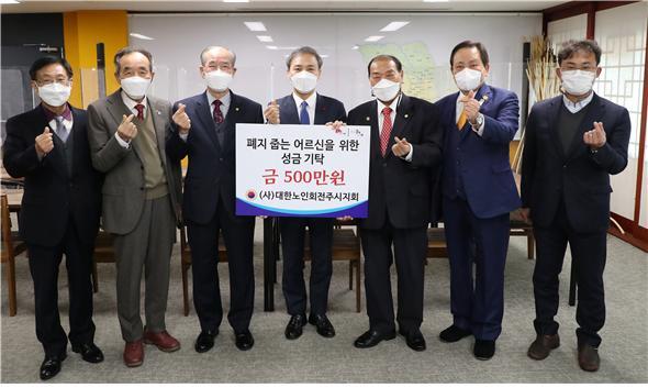 (사)대한노인회 전주시지회가 16일 폐지 줍는 어르신들을 위한 성금 500만 원을 전주시에 기탁했다.