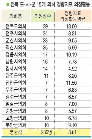 참여자치전북시민연대가 발표한 15곳 도시군의회의 정책질의 및 5분발언, 조례안, 의안발의 등의 횟수를 총괄한 정량지표 의정활동 평균값은 8.81건으로 나타났다. 이 가운데 전북도의회가 13.00건으로 가장 많았고, 진안군의회 11.50건, 정읍시의회 10.19건 순이었다. 가장 적은 의회는 김제시의회 4.92건, 순창군의회 5.57건, 익산시의회 6.50건, 장수군의회 6.57건, 고창군의회 6.78건, 무주군의회 6.83건 순이었다.