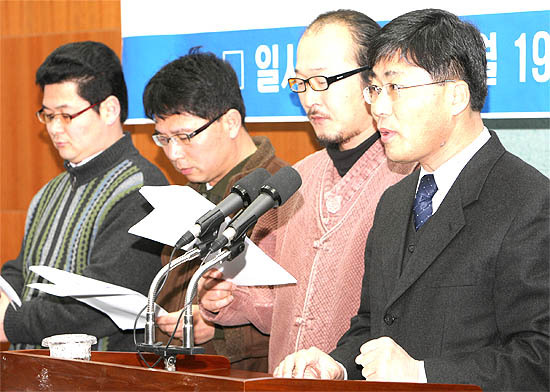 염경석 민노당 전북도당 정책위원장 등 주요 당직자 6명이 19일 도의회 브리핑룸에서 "대선 참패조차 부정되고 편향적 친북행위에 관한 평가혁신(안) 전체가 삭제되는 당 대회를 보면서 이제 민주노동당은 더 이상 변화와 혁신을 통해 희망을 줄 수 있는 우리들의 진보정당이 아니구나 하는 참담한 결론에 이르고 말았다"고 탈당 기자회견을 하고 있다.../안봉주기자 (desk@jjan.kr)