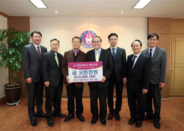 전북대학교 의학전문대학원 영상의학과 동문들이 9일 대학 경쟁력 향상을 위해 써달라며 발전기금 5000만 원을 학교 측에 기탁했다.