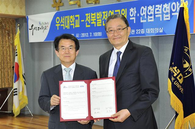 우석대학교(총장 강철규)와 전북발전연구원(원장 김경섭)이 10일 우석대 본관 대회의실에서 학술·연구 교류협약을 위한 MOU를 체결하고 본격적인 교류에 들어갔다.