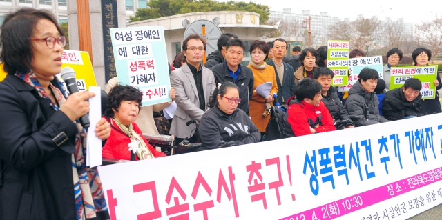 ▲ 66개 시민사회단체로 구성된 '장애인성폭력 대책위'가 2일 전북지방경찰청 앞에서 성폭력 사건 추가 가해자에 대한 구속수사를 촉구하고 있다.